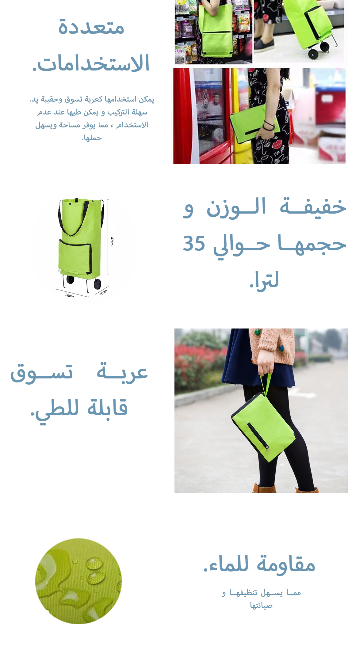 تتميز العربة بعجلات متينة و يمكن طيها بسهولة عندما لا تكون قيد الاستخدام ، مما يسمح بسهولة التخزين والنقل.
